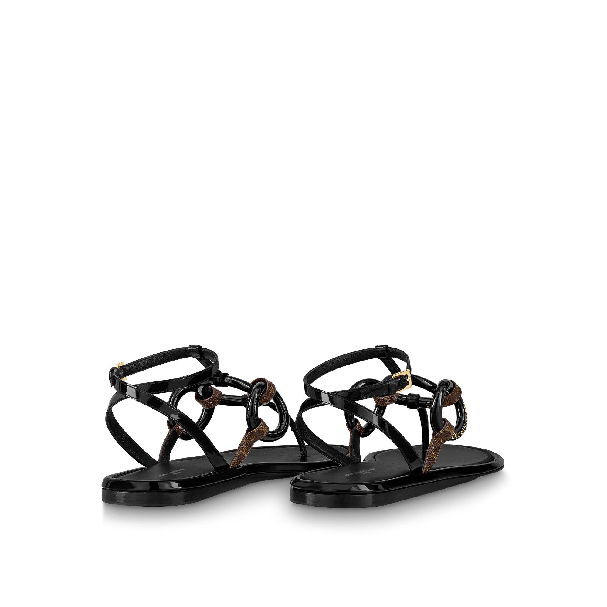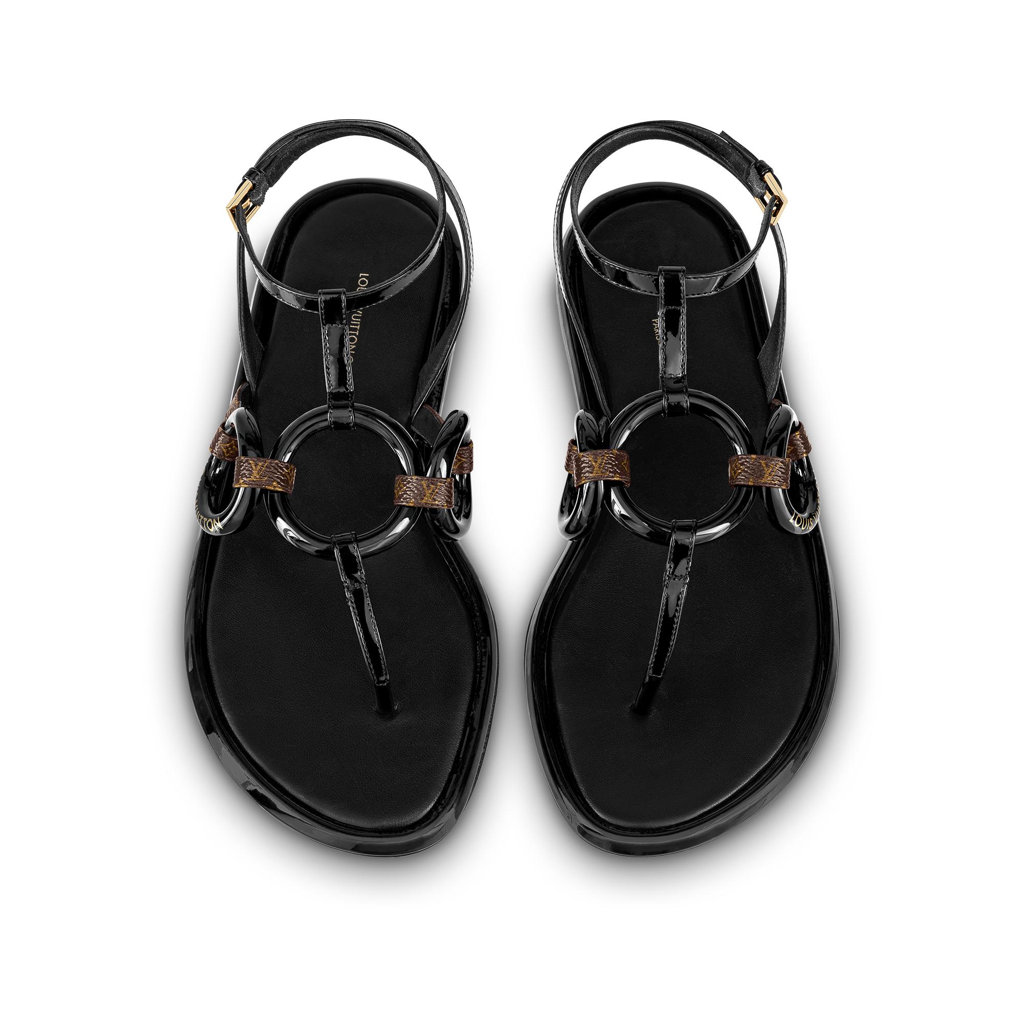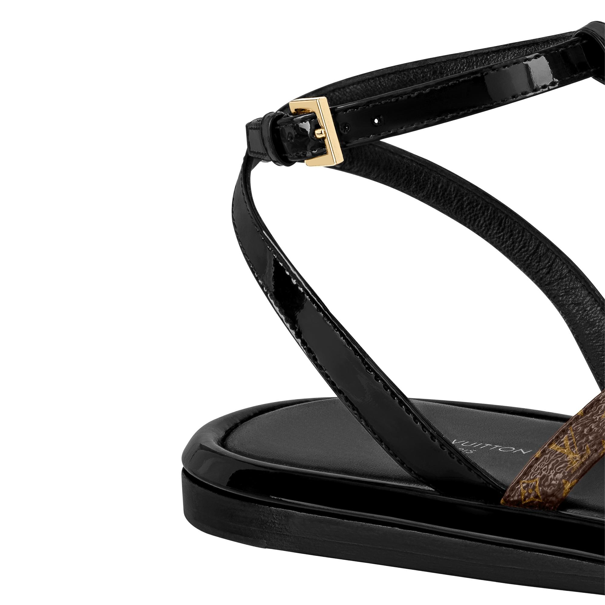 The Vedette flat sandal is an elegant style distinguished by its slender straps in patent calf leather and Monogram canvas. These are complemented by two rings, one of which is engraved with the Louis Vuitton signature. This model, which is adjusted around the ankle with a tiny, gold-tone buckle, is finished with a padded outsole. Product details Black Patent calf leather Leather outsole Louis Vuitton signature on one ring Patent Monogram-canvas straps Made in Italy1AA1JH Louis Vuitton Vedette Flat Sandal - Women - ShoesWomen - Shoes - Sandals and Espadrilles - Vedette Flat Sandal