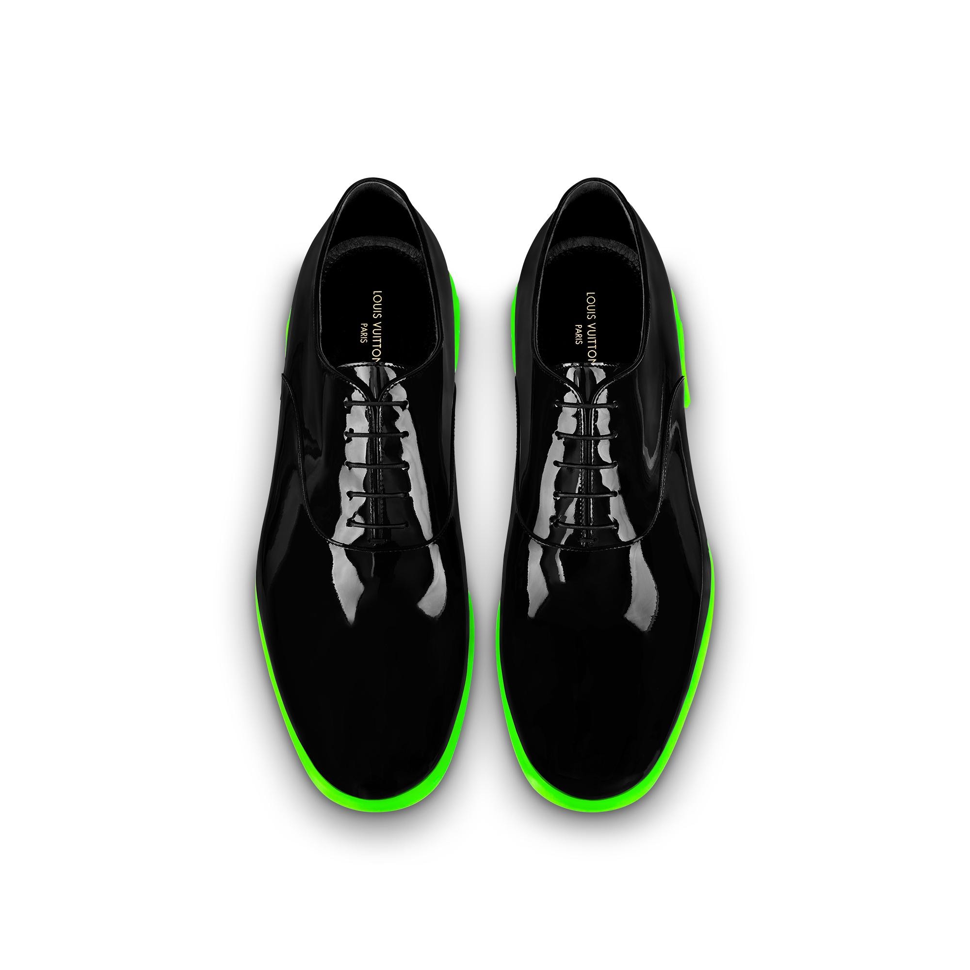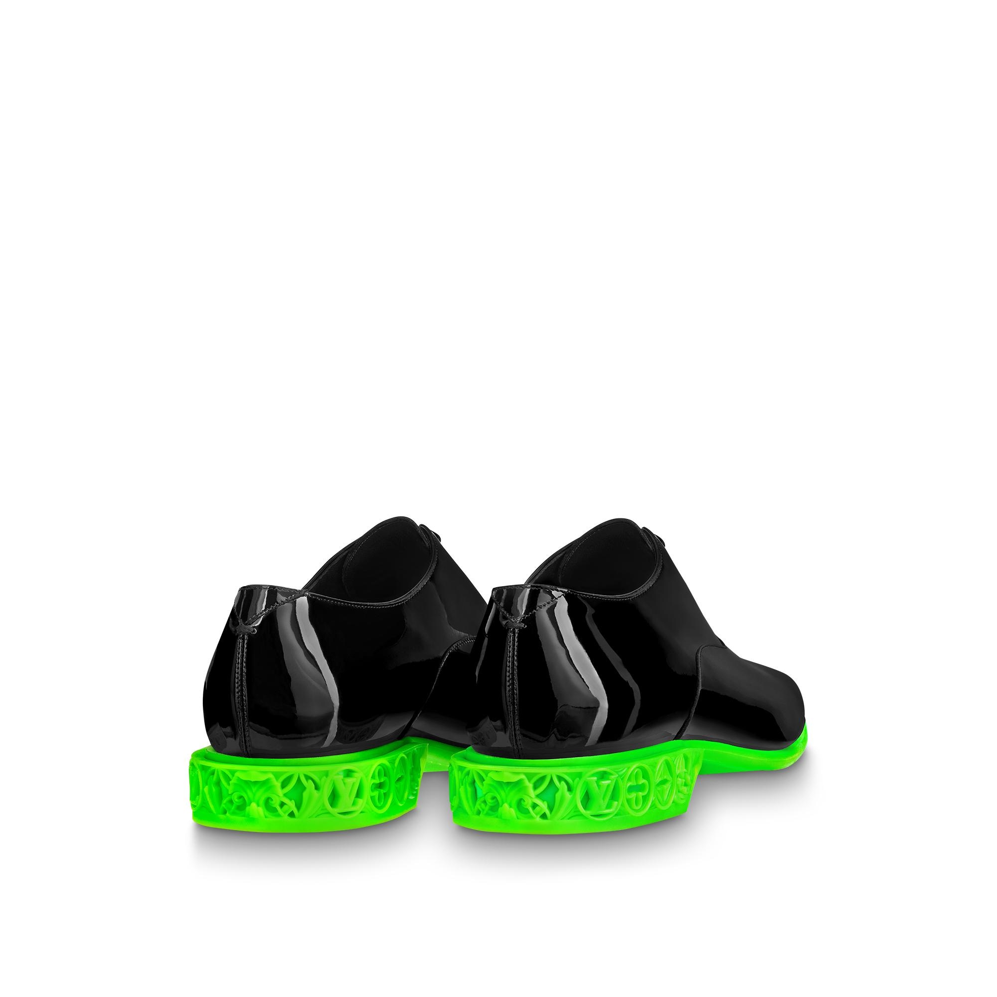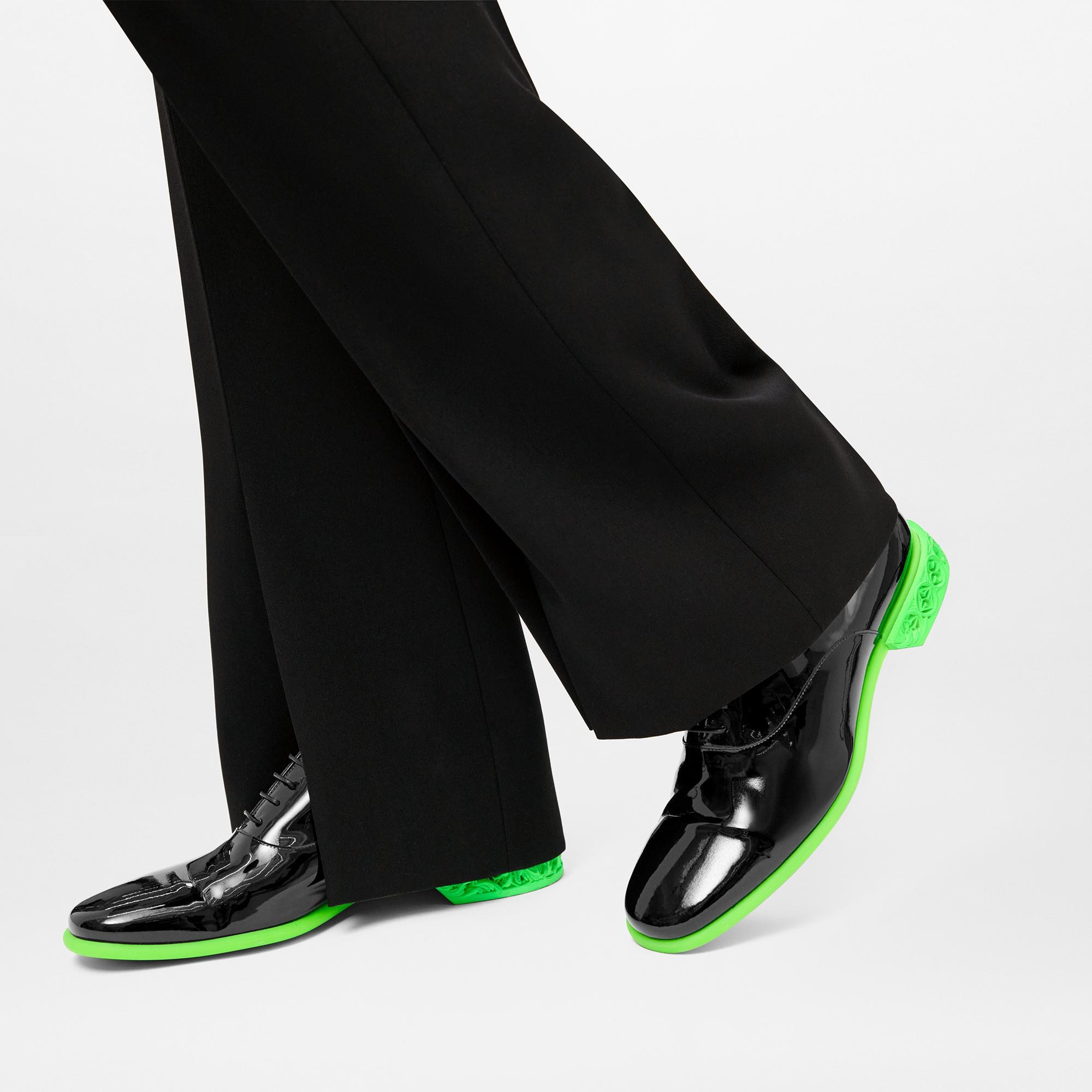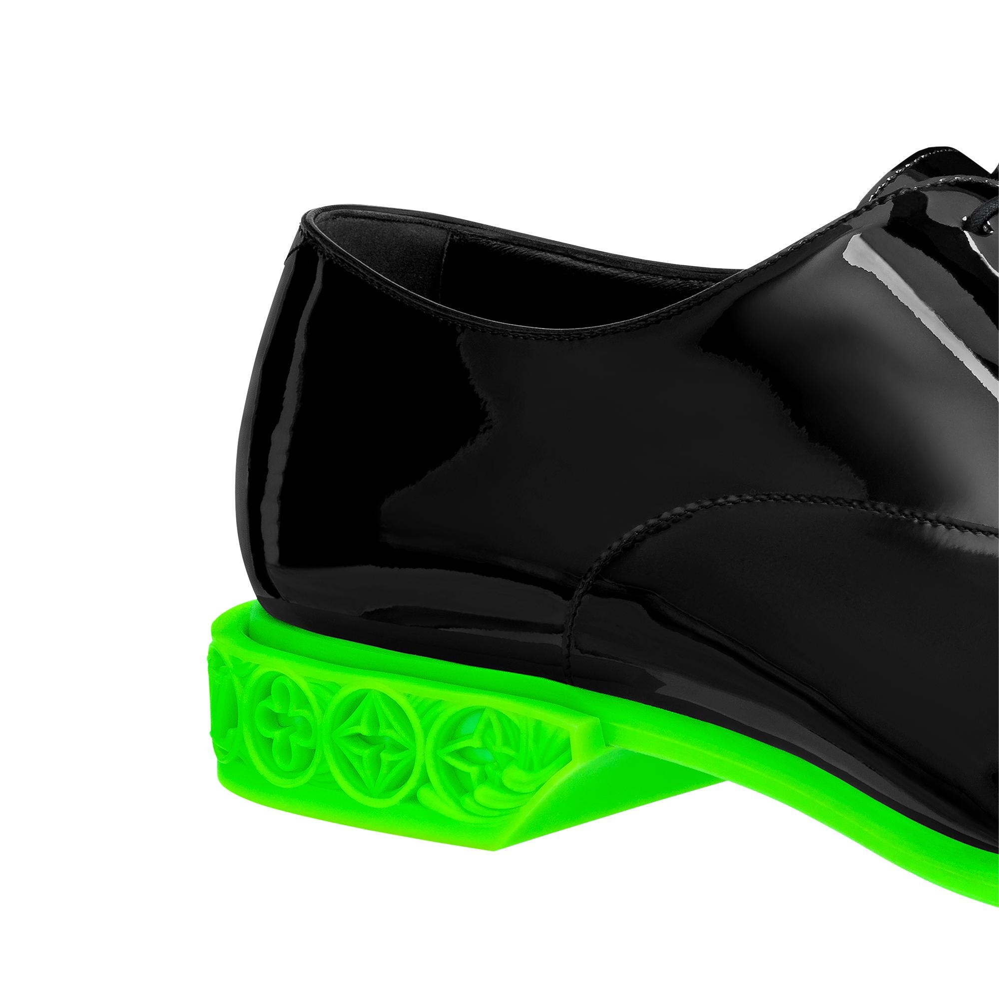 Seen at Louis Vuitton's Spring-Summer 2022 men's show, the LV Formal Dimension richelieu is crafted from glossy patent calf leather. Contrasting with the classic upper, the colorblock rubber outsole features a heel engraved with the LV Initials and Monogram Flowers, creating an original 3D-print effect. Product details Green Patent calf leather Rubber outsole Monogram Flowers and LV Initials on the heel Made in Italy1A9UZL Louis Vuitton LV Formal Dimension Richelieu - Men - ShoesMen - Shoes - Buckles and Lace-Ups - LV Formal Dimension Richelieu