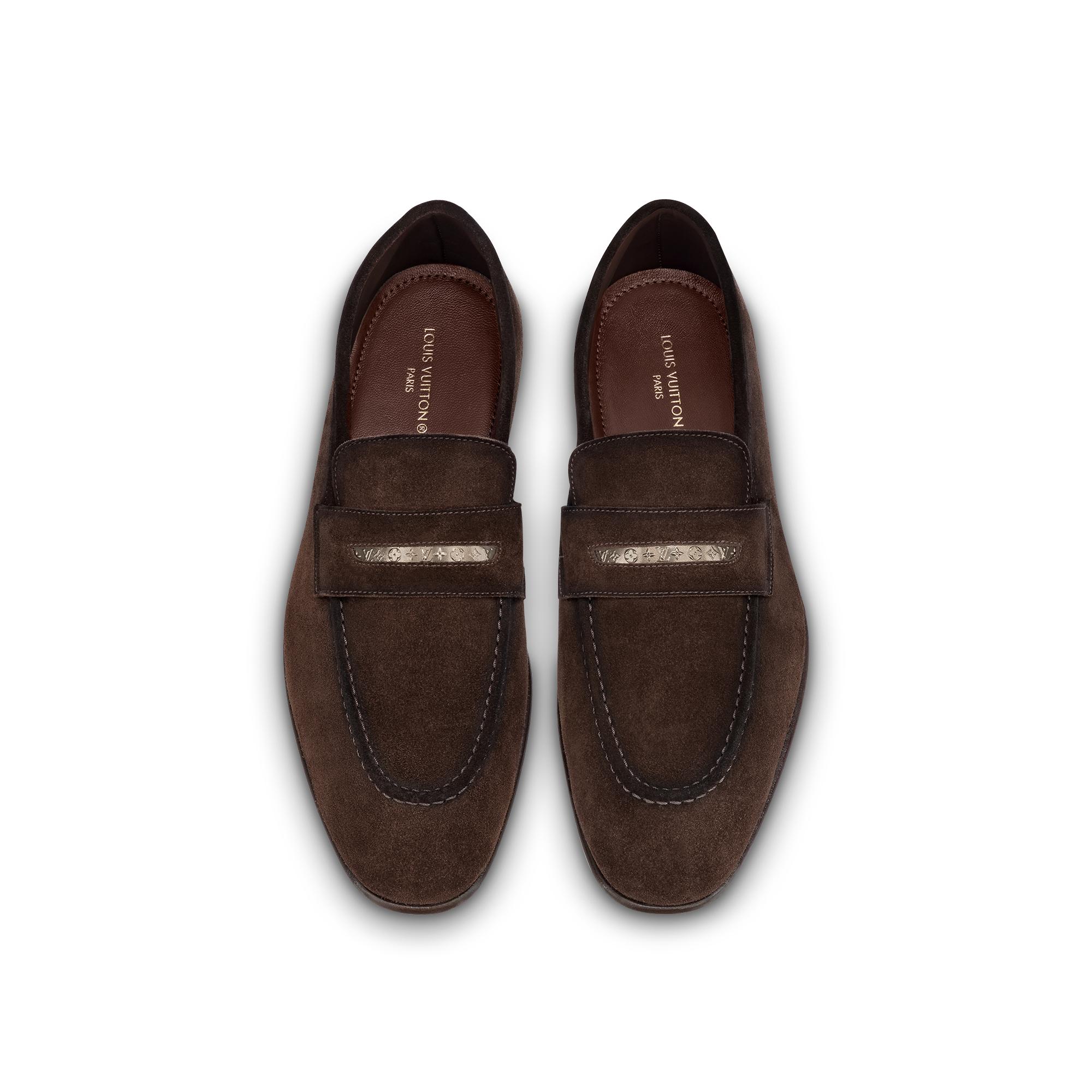 The LV Glove loafer is crafted from waxed suede calf leather, a refined material which complements its sleek design. Testifying to Louis Vuitton's savoir-faire, this model has a Sacchetto Flex construction for suppleness and lightness. It is discreetly signed with an anodized Monogram accessory on the strap. Product details Moka Brown Waxed suede calf leather Sacchetto Flex construction Leather outsole with the Louis Vuitton ready-to-wear staple signature Monogram accessory Made in Italy1AA2BU MochaLouis Vuitton LV Glove Loafer - Men - ShoesMen - Shoes - Loafers and Moccasins - LV Glove Loafer