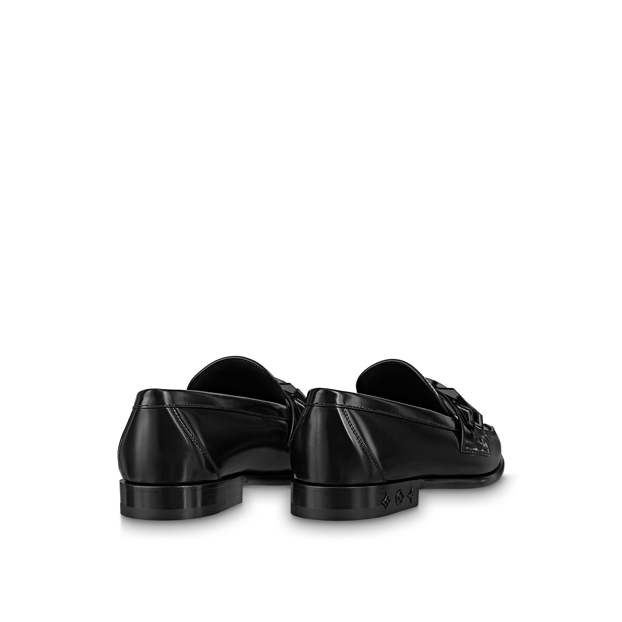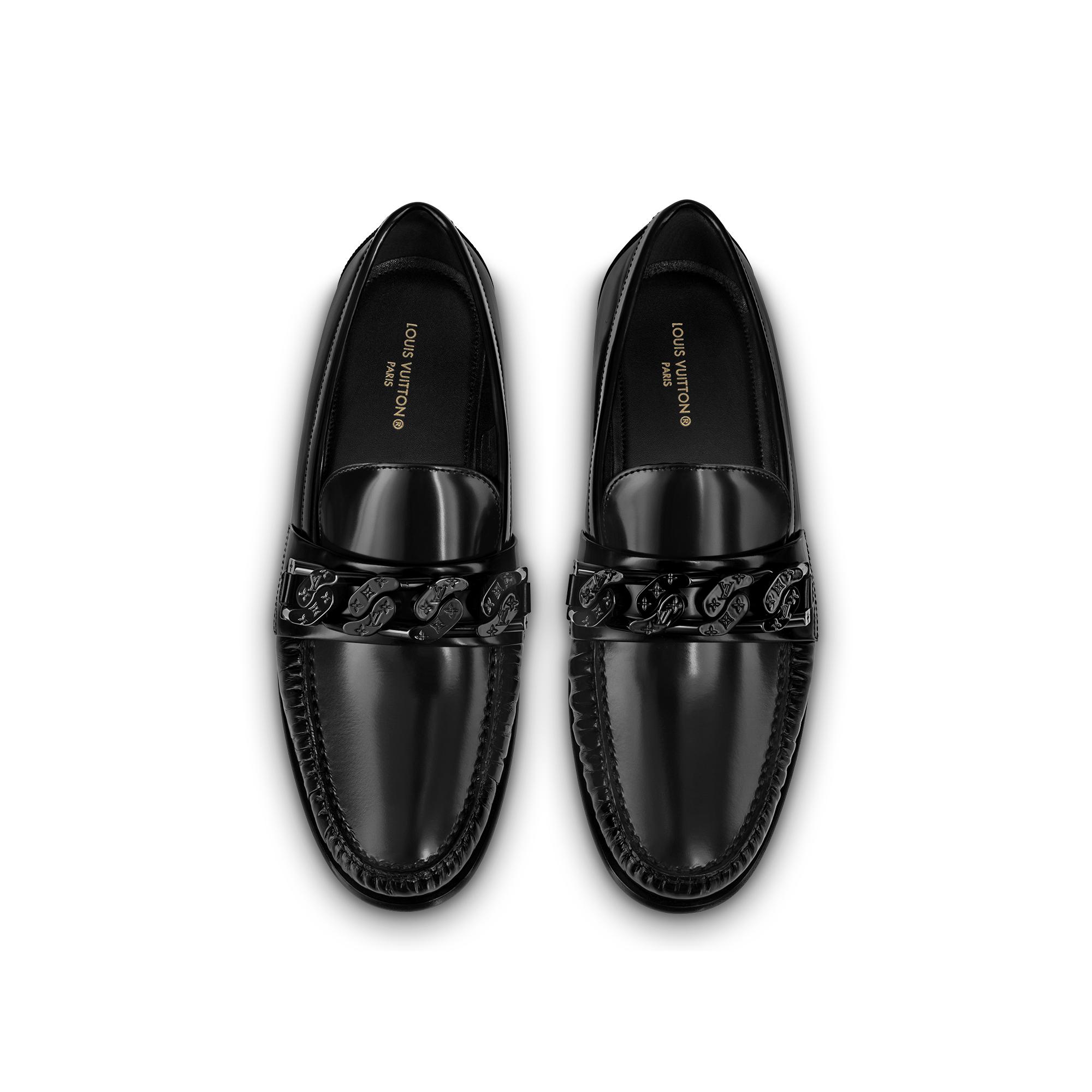 The LV Loafer is Louis Vuitton's fashionable reinterpretation of the classic penny loafer. It is crafted from glazed calf leather and accessorized with an oversized chain in tonal metal, which is engraved with motifs of Monogram Flowers. This model is finished with a leather outsole. Product details Black Glazed calf leather Blake construction Leather outsole Monogram Flowers on the chain Made in Italy1AA7LB Louis Vuitton LV Loafer Loafer - Men - ShoesMen - Shoes - Loafers and Moccasins - LV Loafer Loafer