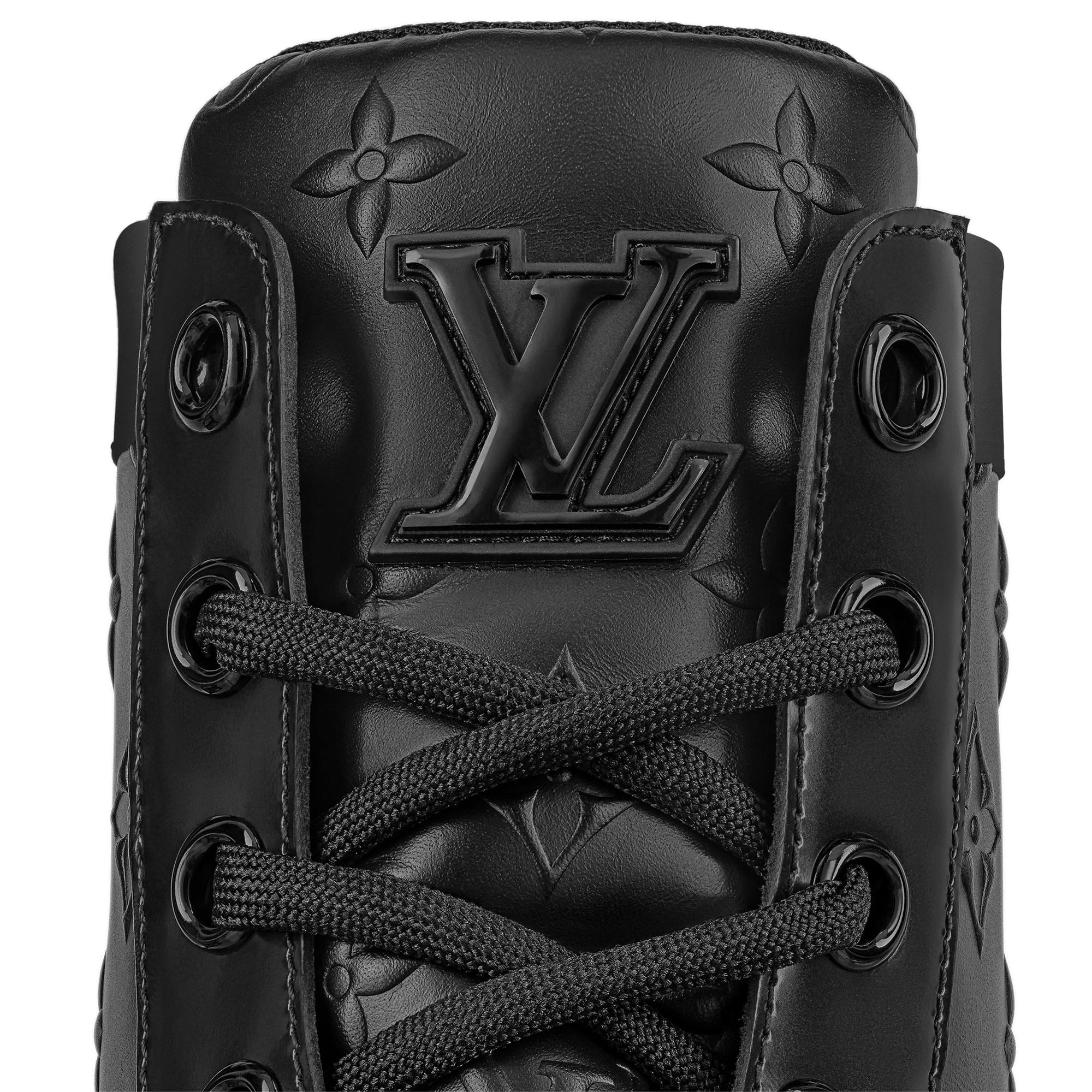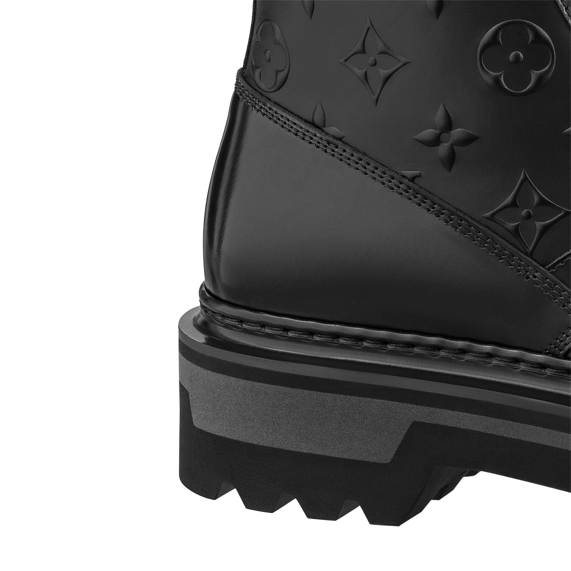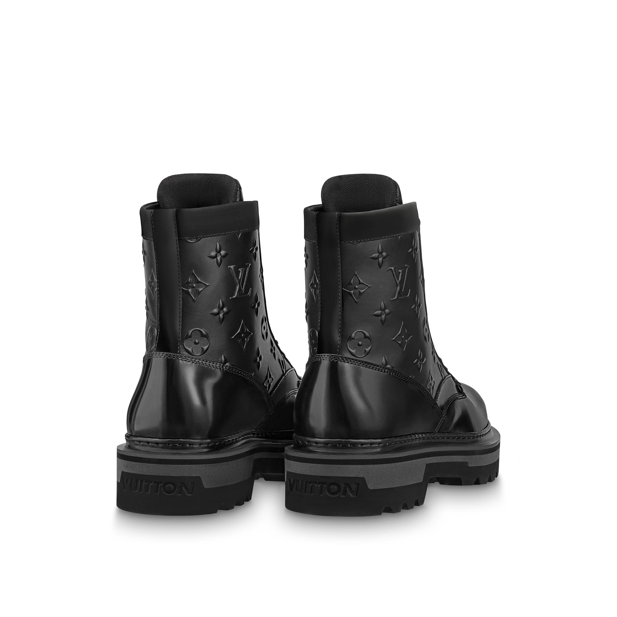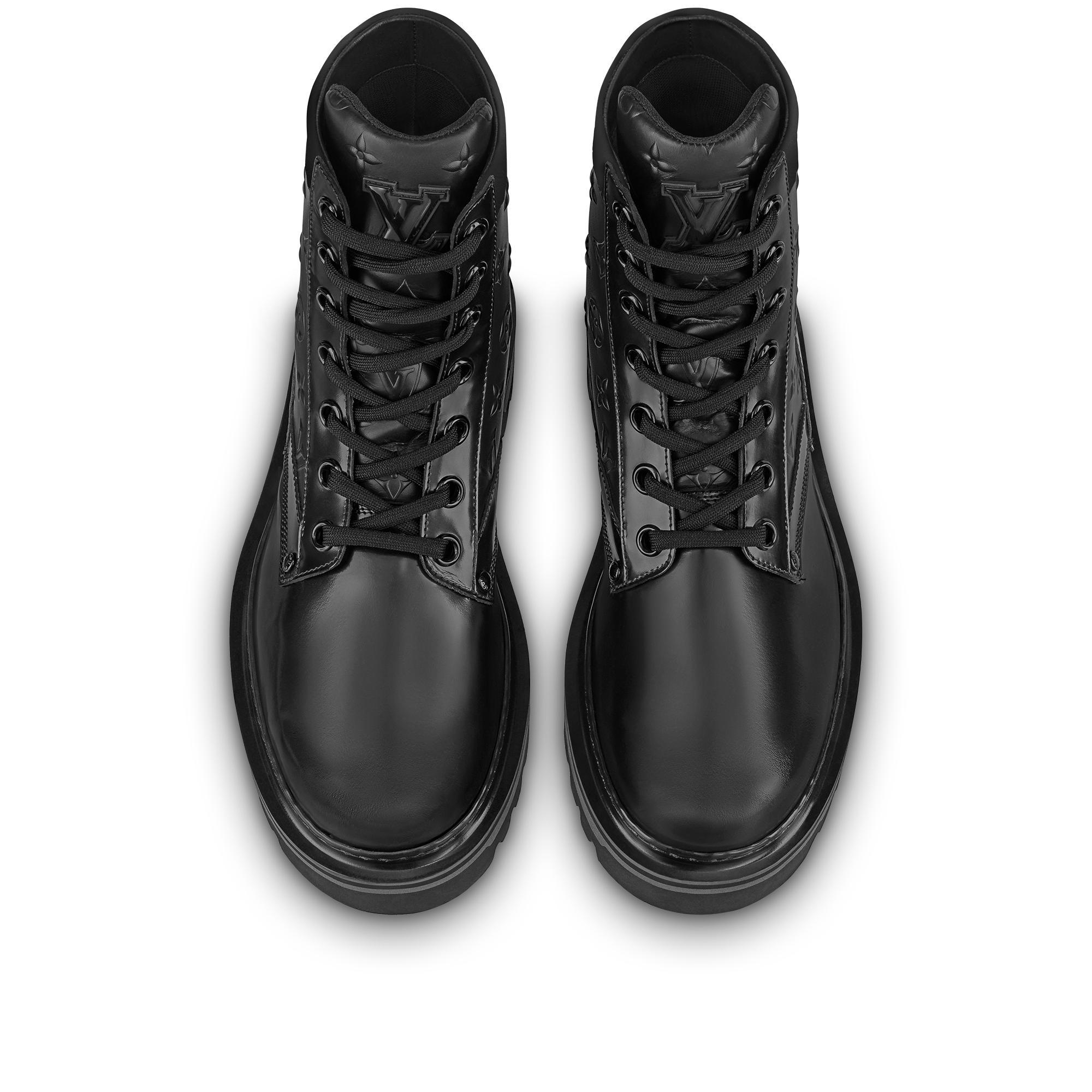 The LV Ranger ankle boot combines calf leather debossed with the iconic Monogram pattern with glazed calf-leather trim. Inspired by military combat boots, this style features long laces and a sturdy yet lightweight micro outsole with a prominent tread. It is signed with the LV Initials in rubber on the tongue. Product details Black Monogram-debossed calf leather and glazed calf leather Treaded micro outsole LV Initials on the tongue Made in Italy1A9FDP Louis Vuitton LV Ranger ankle boot - Men - ShoesMen - Shoes - Boots - LV Ranger Ankle Boot