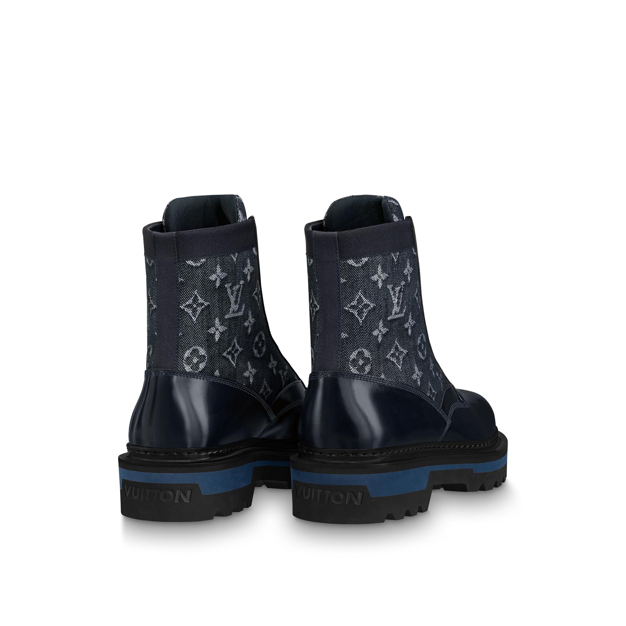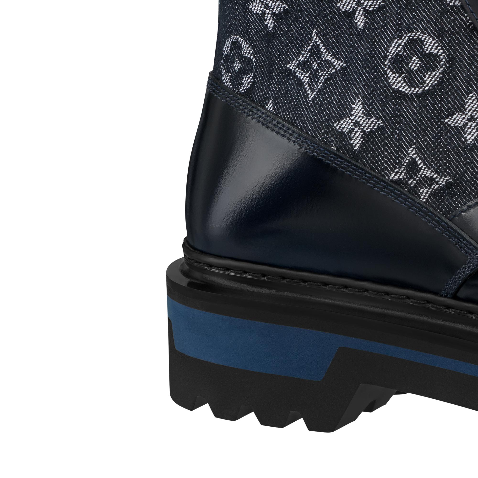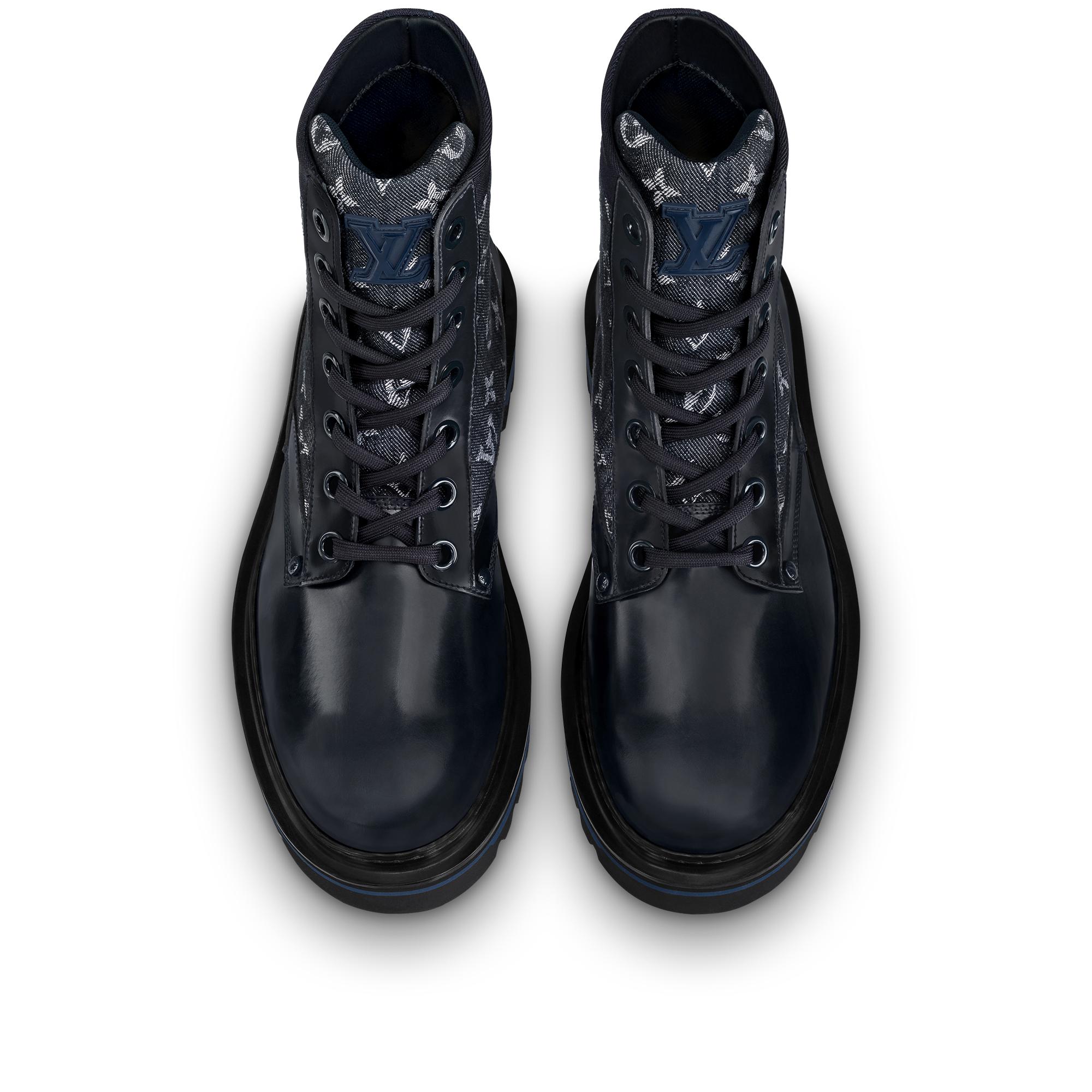 The LV Ranger ankle boot is a military-inspired style characterized by its long laces and prominent tread. This version combines Monogram denim with glazed calf leather for a relaxed look. A sturdy yet lightweight outsole in bicolor micro completes this design, which features the LV Initials in rubber on the tongue. Product details Navy Blue Monogram denim and glazed calf leather Treaded micro outsole LV Initials on the tongue Made in Italy1A9HLM Louis Vuitton LV Ranger ankle boot - Men - ShoesMen - Shoes - Boots - LV Ranger Ankle Boot