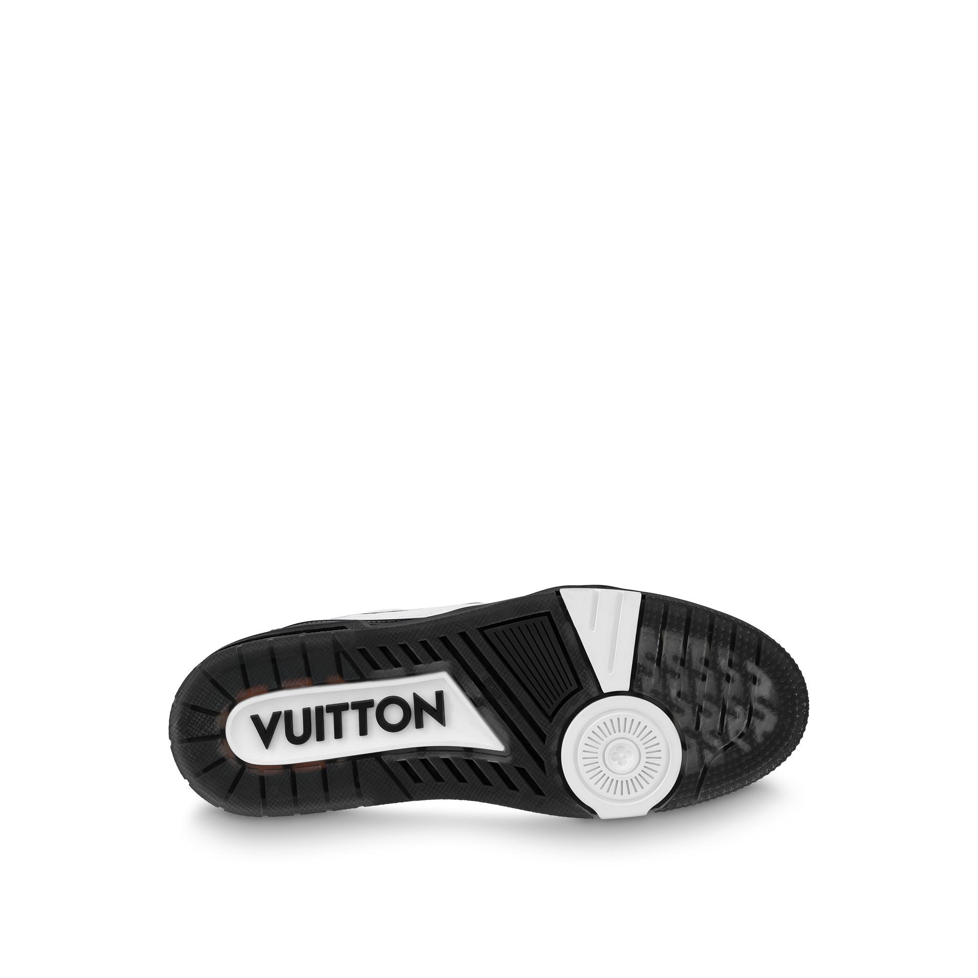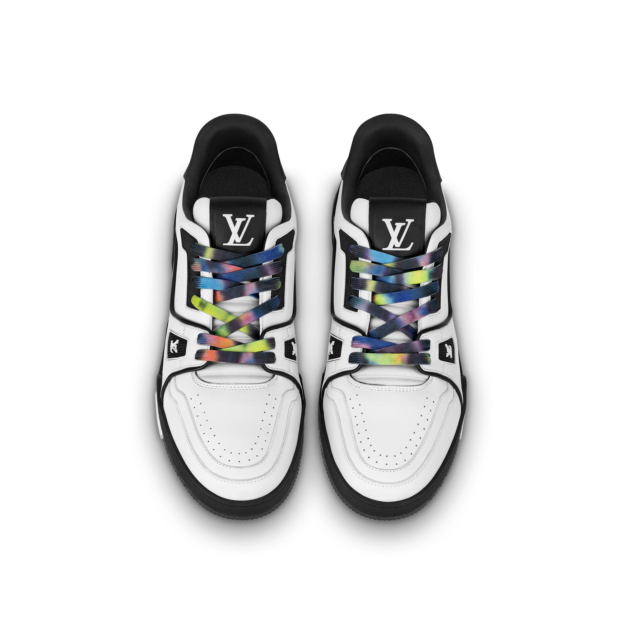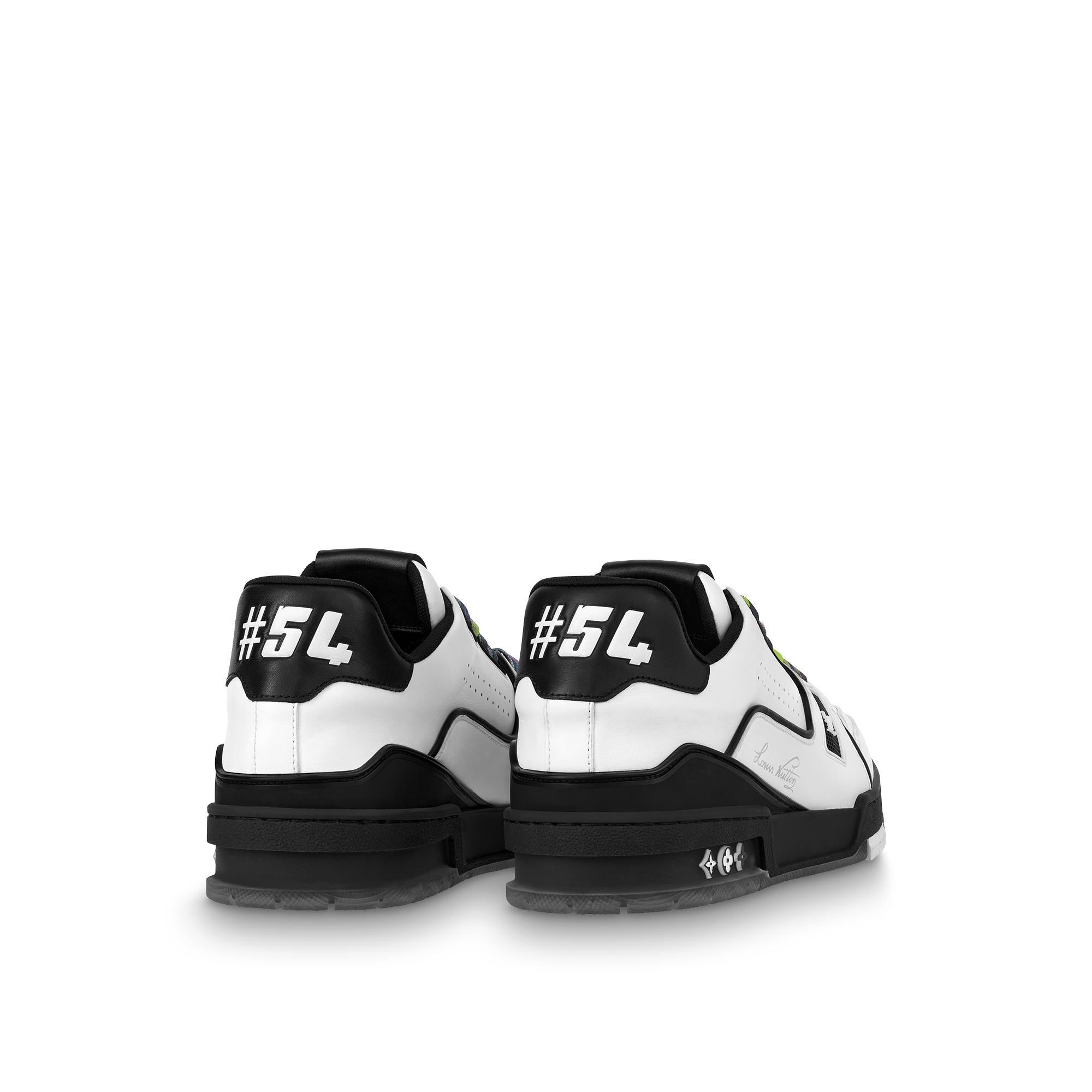 This graphic interpretation of the cult LV Trainer sneaker comes in bicolor calf leather. Tie-dye laces, inspired by the season's ready-to-wear collection, add a touch of color. This model bears Virgil Abloh's handwritten Louis Vuitton signature on the side, while the #54 logo at the back refers to 1854, the date the House was founded. Product details Black / White Calf leather 7 hours of stitching for one pair Rubber outsole LV Initials on the tongue and side Louis Vuitton script signature on the side #54 signature on the back Monogram Flowers on the outsole Made in Italy1A9ADA Louis Vuitton LV Trainer Sneaker - Men - ShoesMen - Shoes - Sneakers - LV Trainer Sneaker