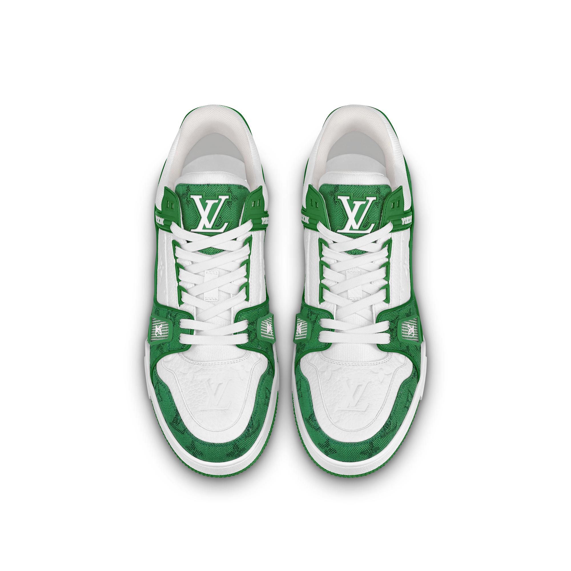 Designed by Louis Vuitton Artistic Director Virgil Abloh, the iconic LV Trainer sneaker is revisited this season in Monogram denim and Monogram-embossed grained calf leather. The contrasting colors and materials highlight the elaborate construction of this model, which was inspired by vintage basketball sneakers. A single pair takes seven hours to stitch. Product details Green Monogram denim and Monogram-embossed grained calf leather 7 hours of stitching for one pair Rubber outsole LV Initials on the tongue, side and back Vuitton signature on the side Monogram Flowers on the outsole Made in Italy1A9JHZ GreenLouis Vuitton LV Trainer Sneaker - Men - ShoesMen - Shoes - Sneakers - LV Trainer Sneaker