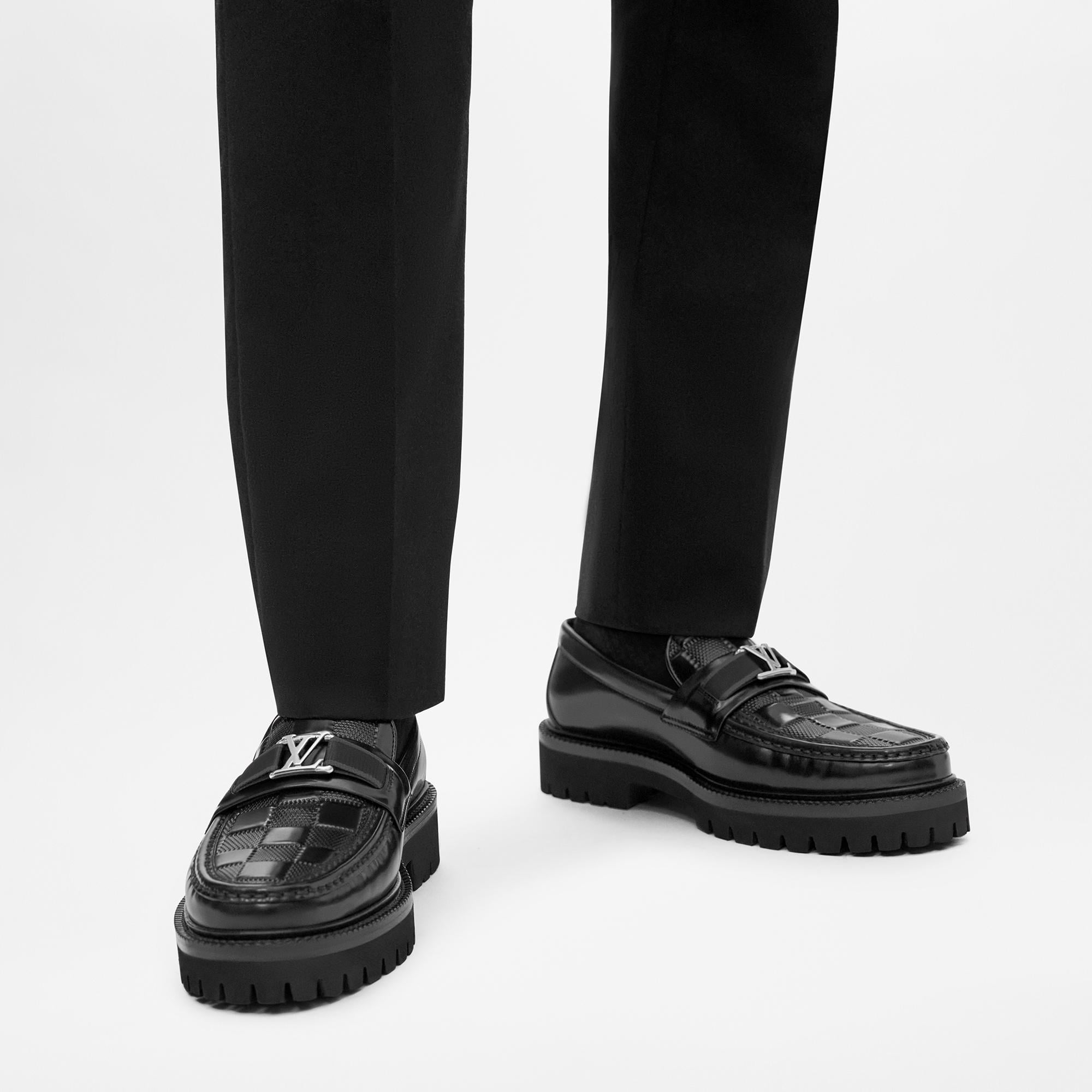 This reinterpretation of the Major loafer combines a classic business upper with a chunky, yet extremely lightweight, micro rubber outsole. The upper is crafted from glazed calf leather and complemented by a vamp in Damier-embossed calf leather, which is finished with an LV Initials accessory. Product details Black Glazed calf leather and Damier-embossed calf leather Micro rubber outsole LV Initials accessory Made in Italy1A9HXA Louis Vuitton Major Loafer - Men - ShoesMen - Shoes - Loafers and Moccasins - Major Loafer