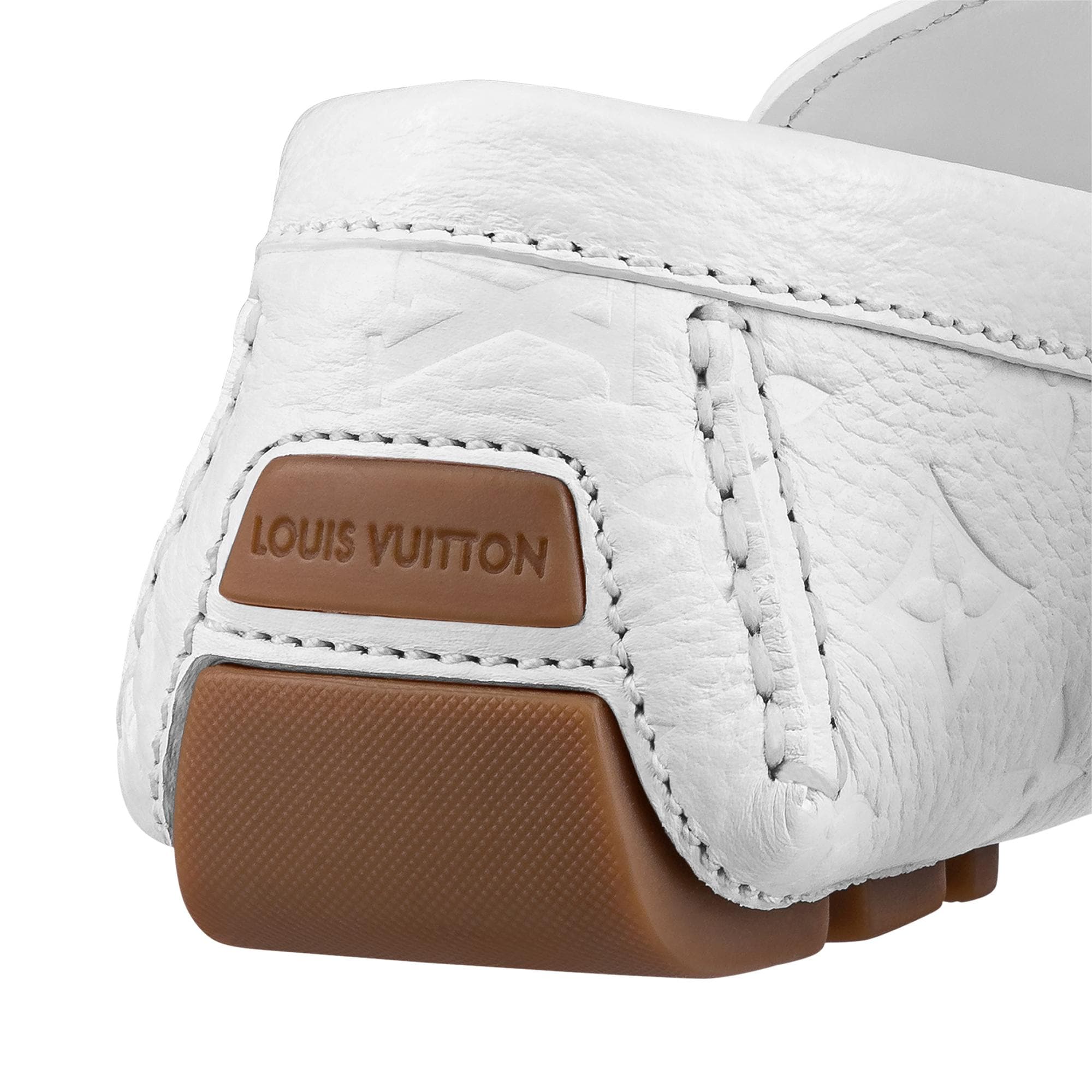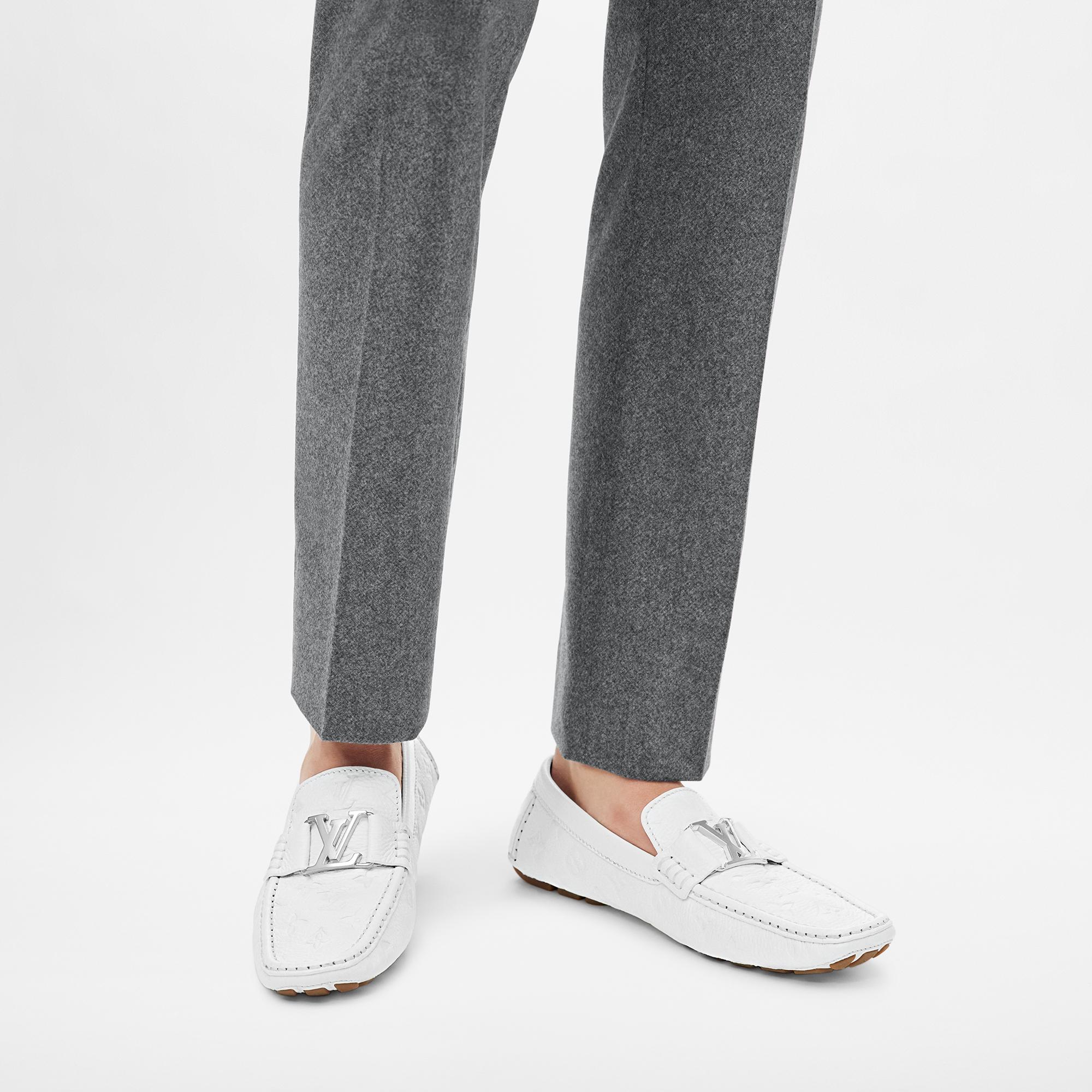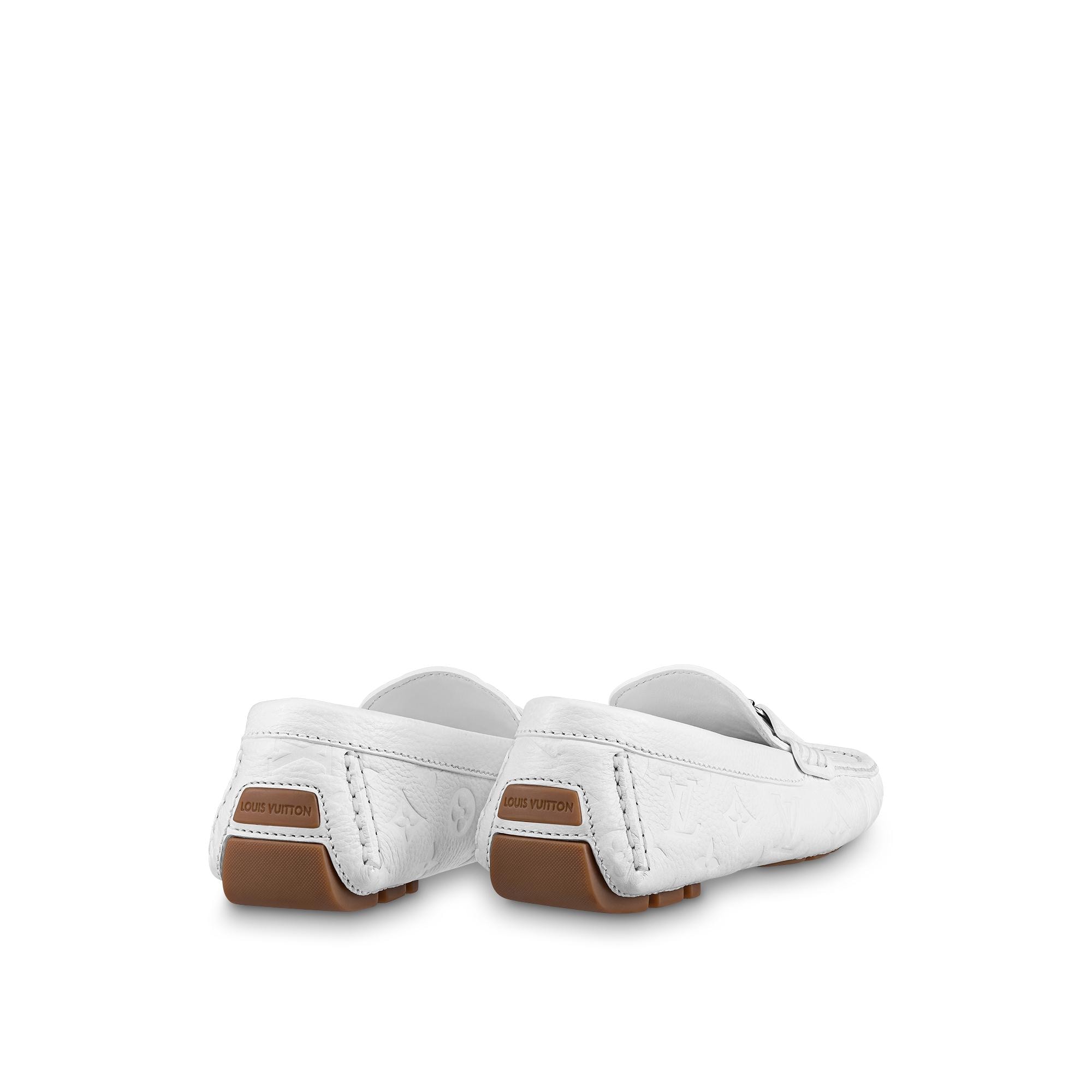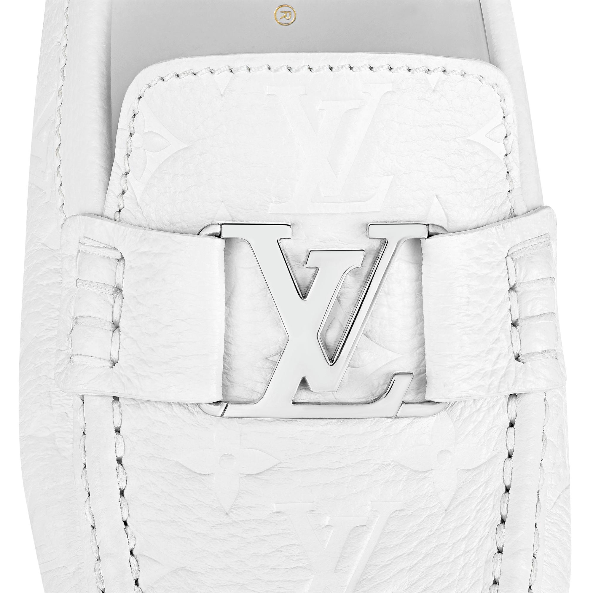 One of Louis Vuitton's most iconic styles, the Monte Carlo moccasin is reinterpreted in grained calf leather embossed with the Monogram pattern. Its hand-stitched vamp is embellished with an LV Initials accessory. This model has an authentic tubular construction, with no insole, and a flexible outsole with rubber pads at the front and back only. Product details White Monogram-embossed grained calf leather Hand-stitched vamp (1 hour per pair) Hand-painted edges Tubular construction Outsole with large rubber pads LV Initials accessory Made in Italy1A9F88 WhiteLouis Vuitton Monte Carlo moccasin - Men - ShoesMen - Shoes - Loafers and Moccasins - Monte Carlo Mocassin