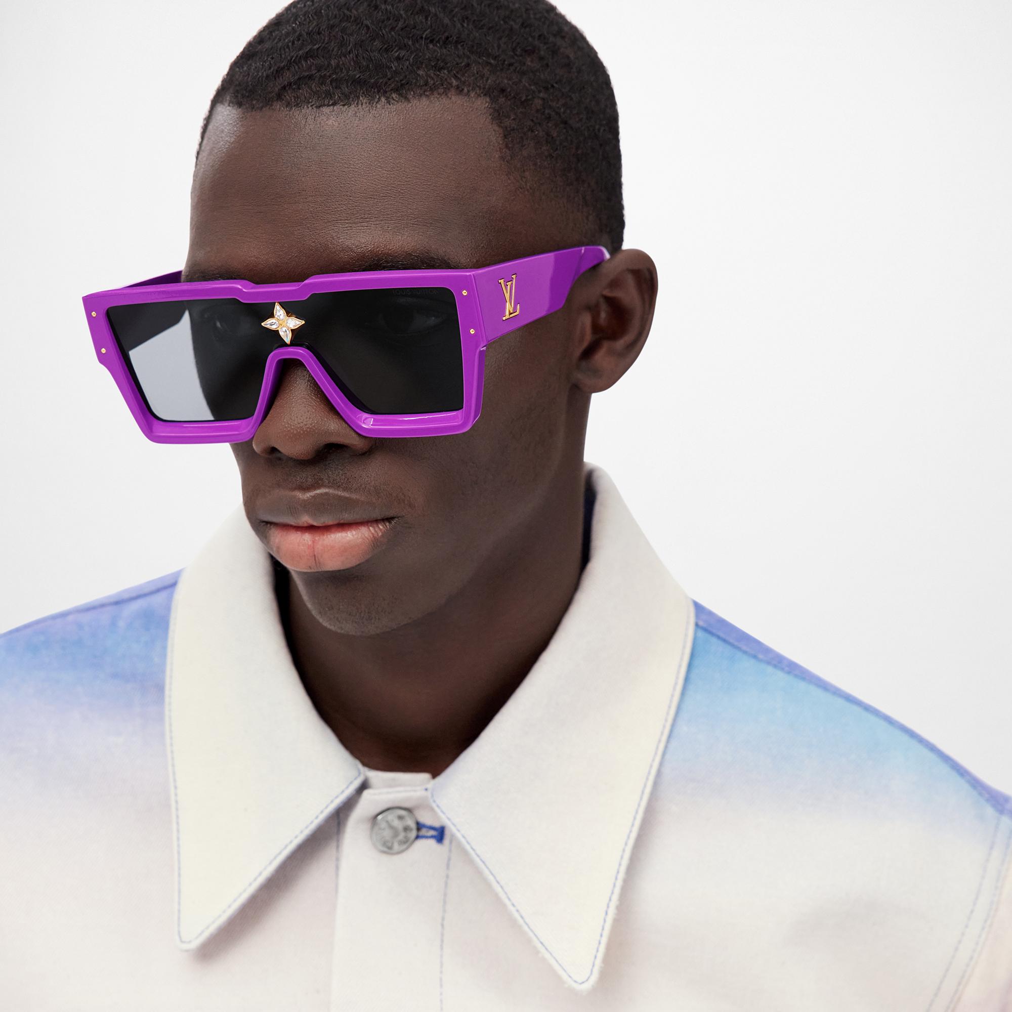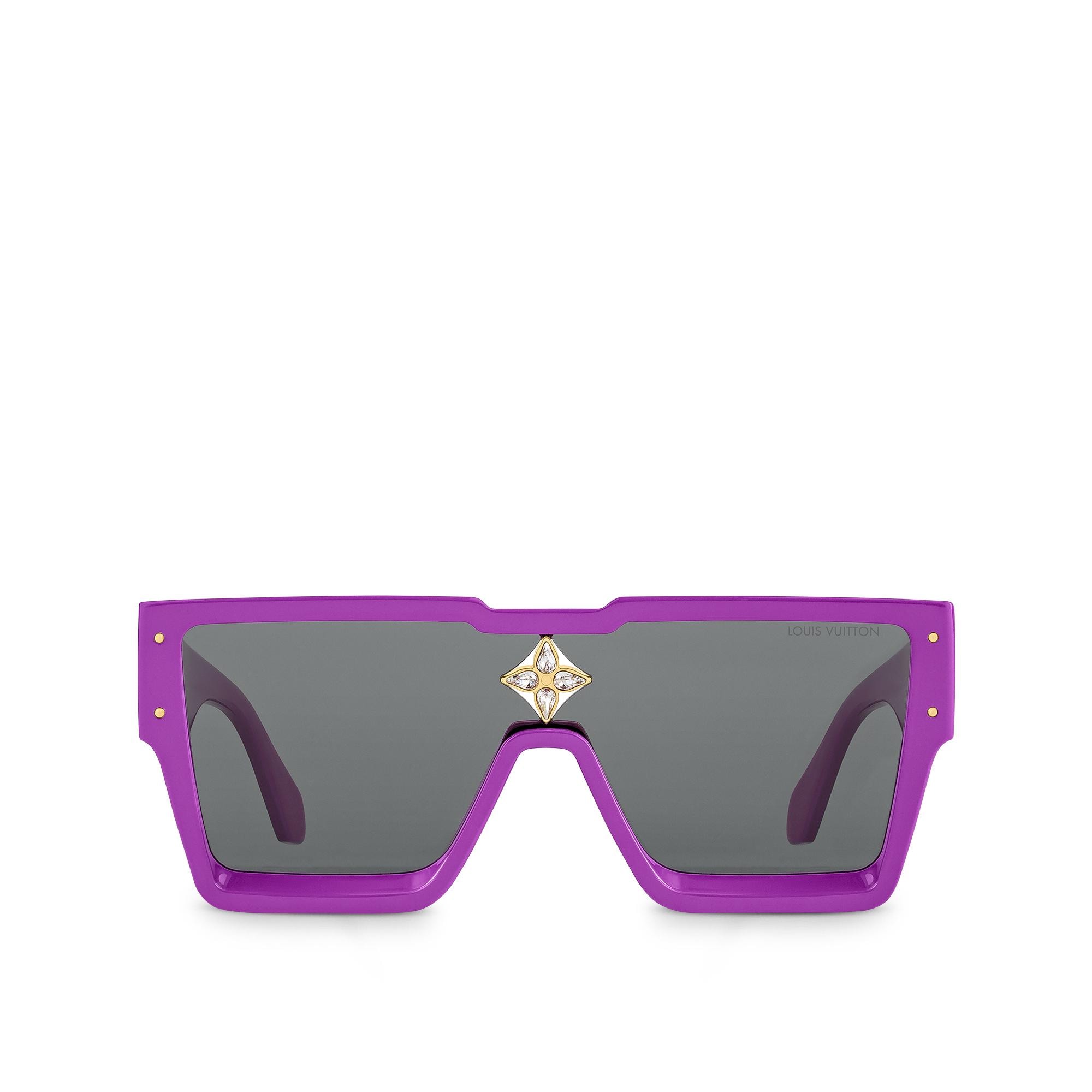 These Cyclone Sunglasses, a classic House style since 2006, are updated for the new season with brightly coloured, patterned frames. The design features a familiar mask silhouette offset by a deep bevelled front. A jewel-like Monogram Flower encrusted with crystals sits on the nose ridge for a statement finish, while LV Initials on the temples ensure instant recognition. Product details 15.3 x 6 cm/6 x 2.4 inches Purple acetate frame Black lenses Gold-colour hardware Bevelled front Monogram Flower with crystal rhinestones LV Initials on temples Louis Vuitton signature lasered on lens Transmittance:12% UV Protection:100% Filter Category:3 Technical details on UV protection and filters hereZ1641W Purple Z1642W Transparent Z1643W BeigeLouis Vuitton Cyclone Sunglasses - Men - AccessoriesMen - Accessories - Sunglasses - Cyclone Sunglasses