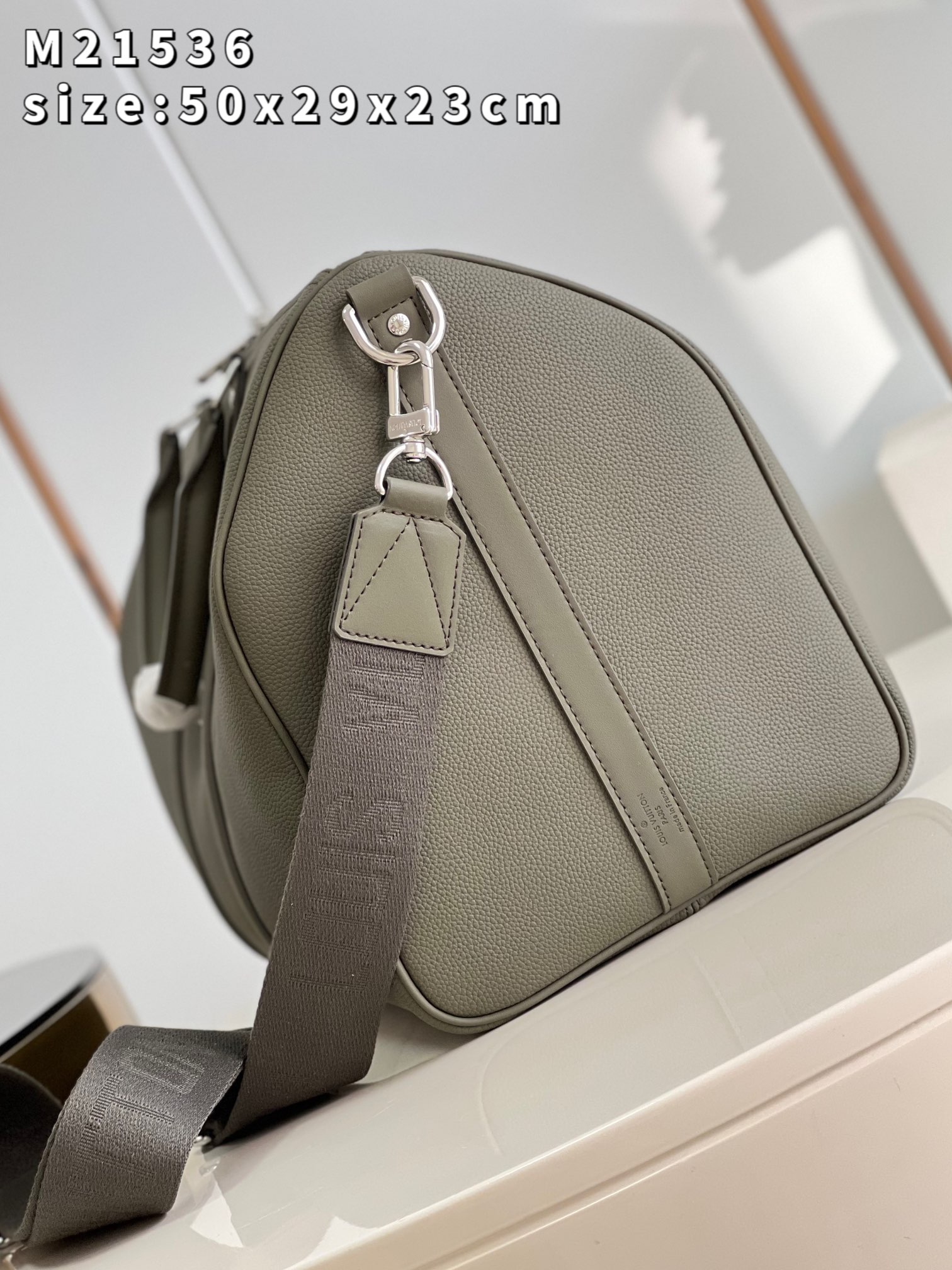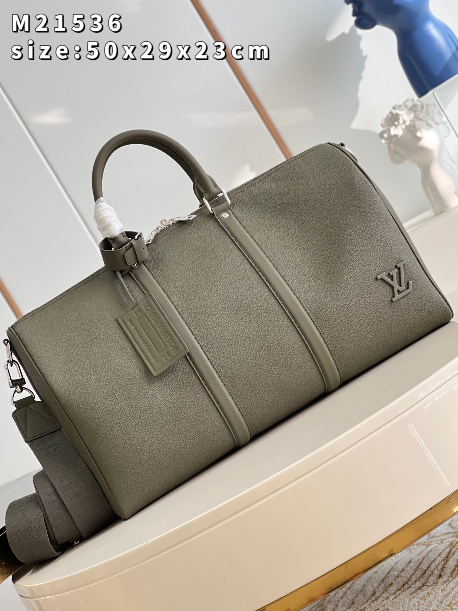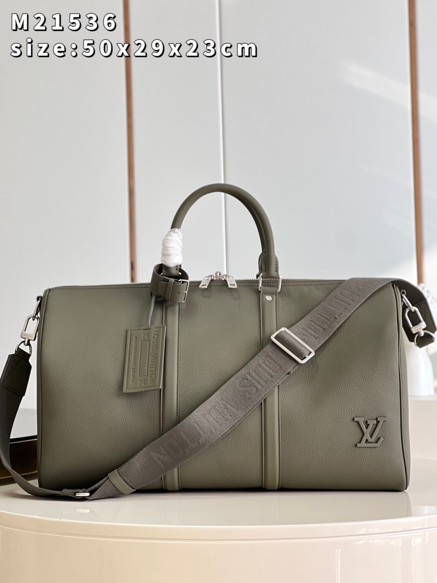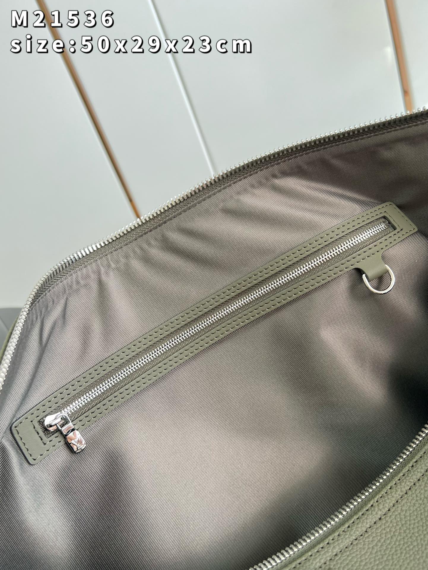 The iconic Keepall now comes in LV Aerogram leather, an exceptional material and a tribute to Louis Vuitton’s leather expertise. Ultra-fine cowhide in elegant khaki is enhanced with signature details inspired by the House’s travel heritage, like the leather tag and the signed Jacquard strap. And it’s a practical carryall, perfect for a weekend or as an extra cabin bag. Product details 19.7 x 11.4 x 9.1 inches (length x Height x Width) • Khaki • LV Aerogram cowhide leather • Cowhide-leather trim • Textile lining • Palladium-color hardware • Zipped closure • Large capacity • Inside zipped pocket • Leather name tag • Strap:Removable, adjustable • Strap drop:14.2 inches • Strap drop max:19.7 inches • Handle:Double M21536 Khaki Louis Vuitton Keepall Bandoulière 50 LV Aerogram - Men - Travel M21536 Khaki