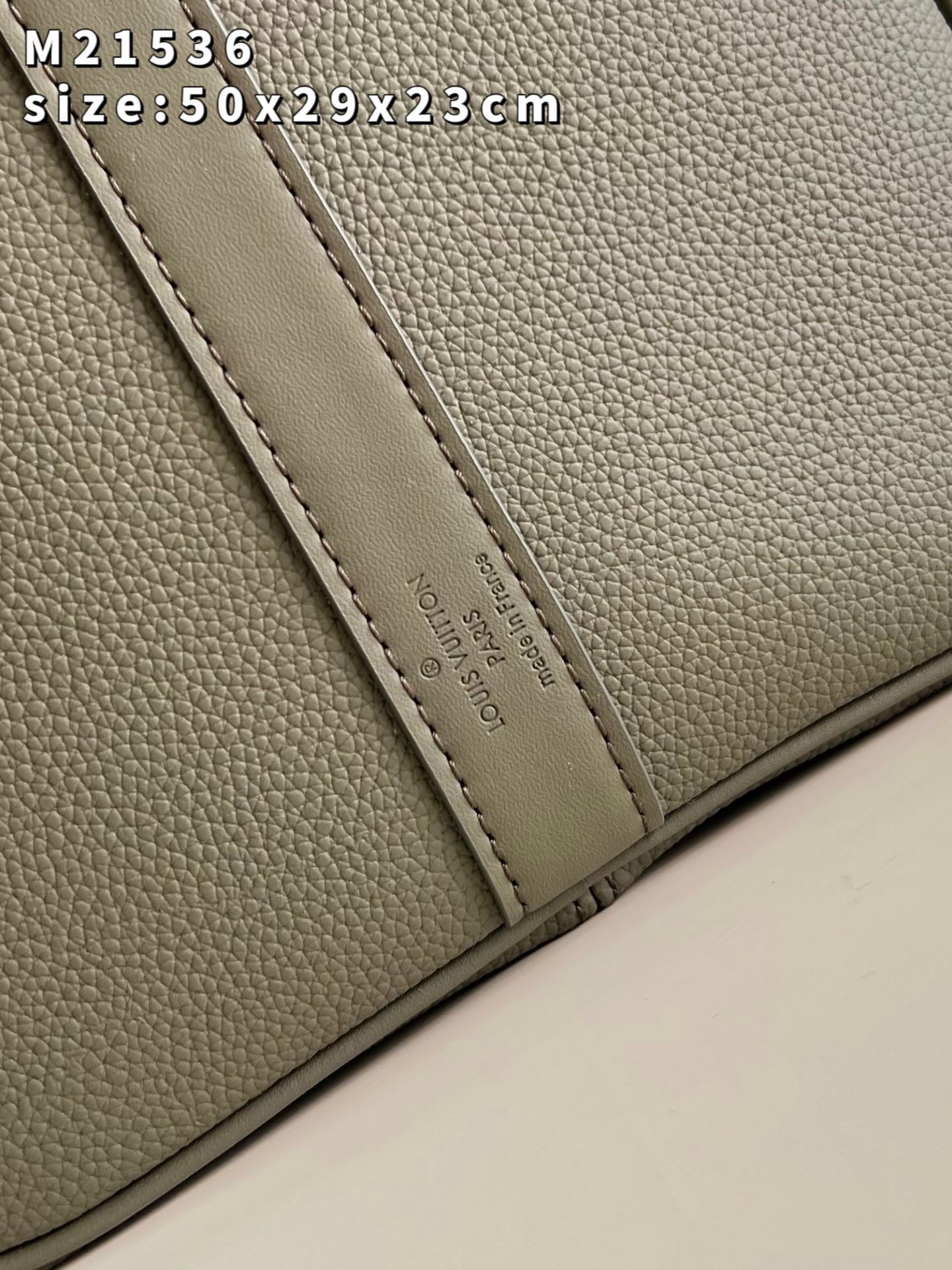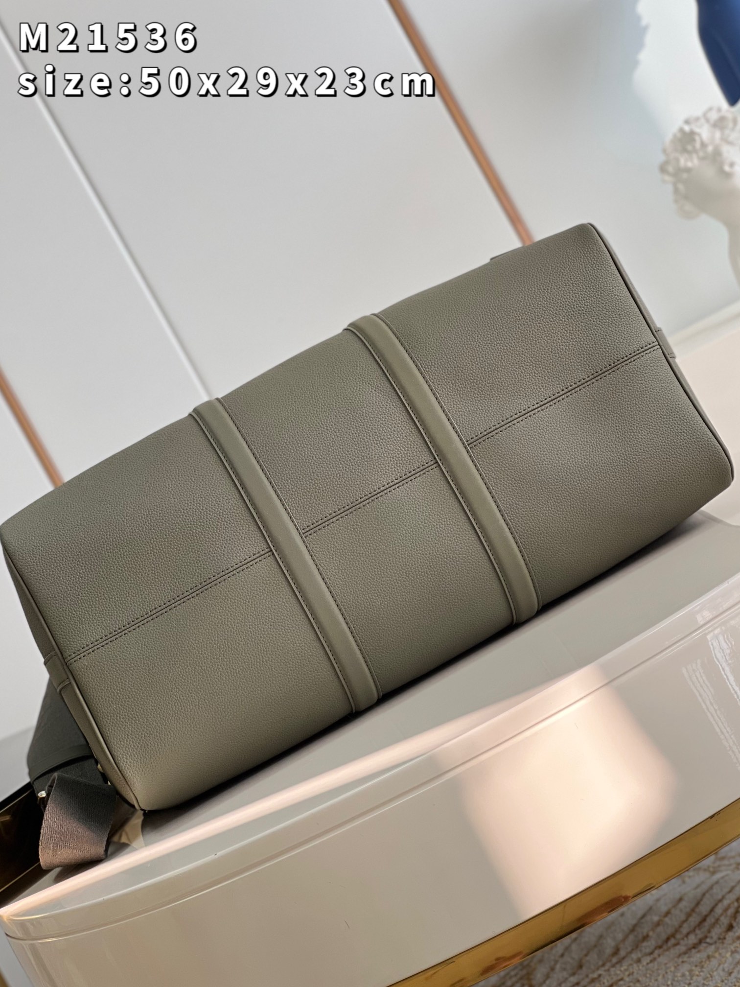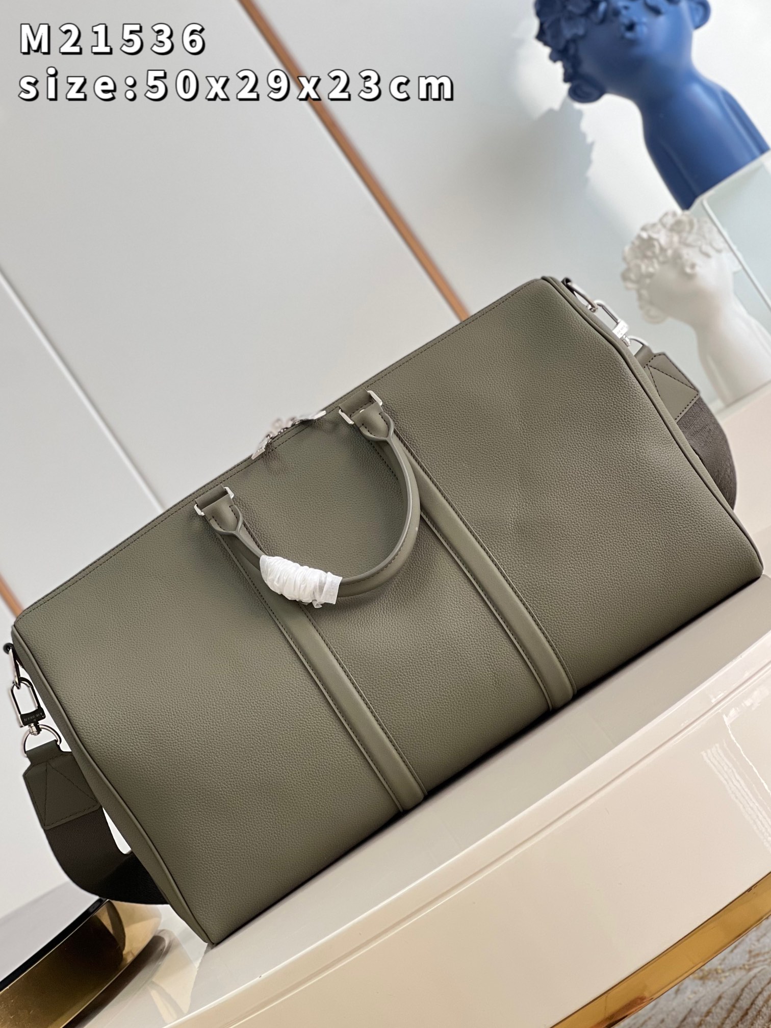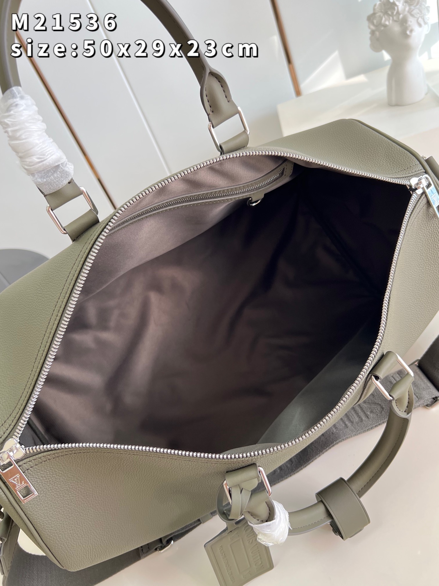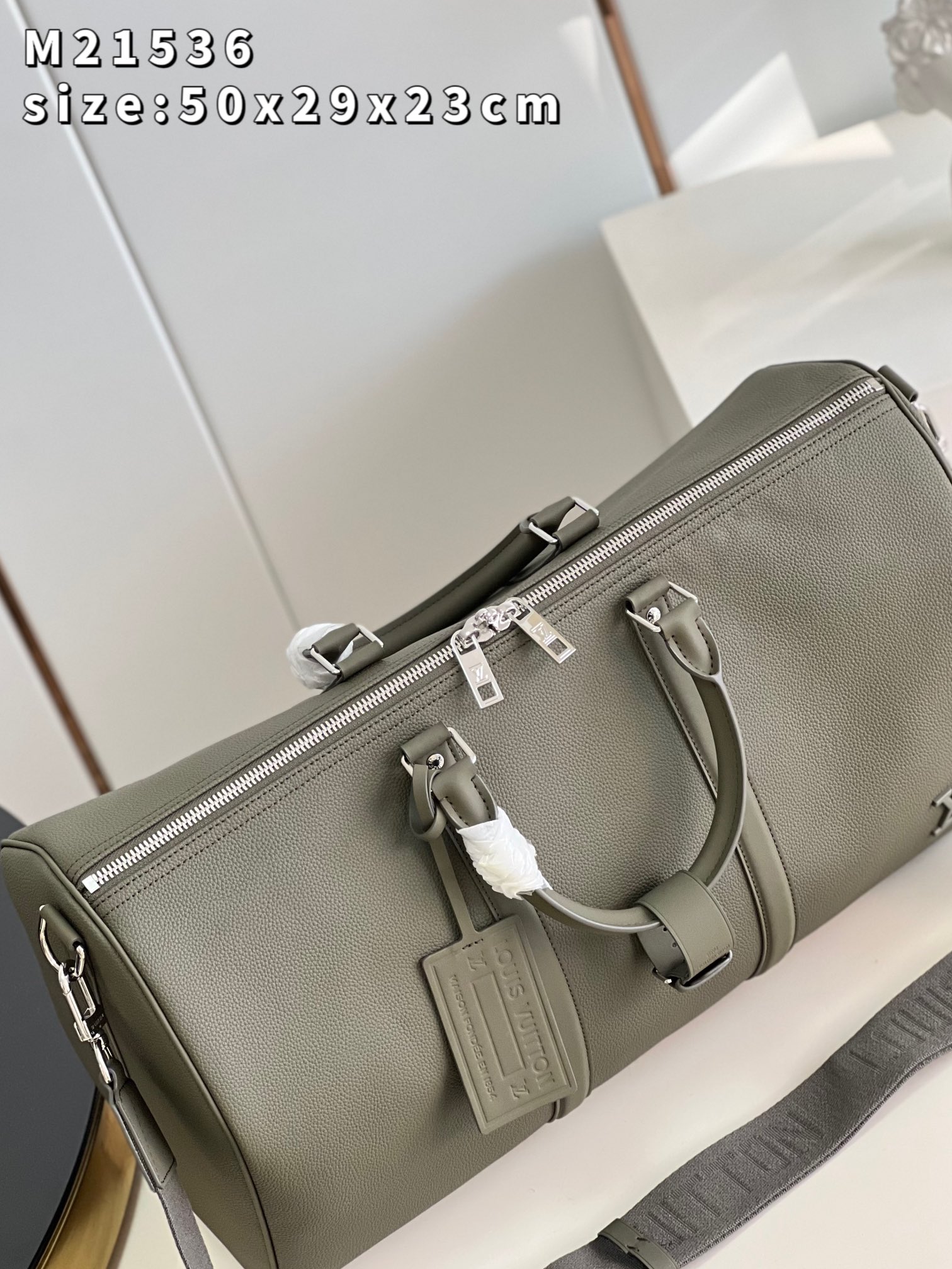 The iconic Keepall now comes in LV Aerogram leather, an exceptional material and a tribute to Louis Vuitton’s leather expertise. Ultra-fine cowhide in elegant khaki is enhanced with signature details inspired by the House’s travel heritage, like the leather tag and the signed Jacquard strap. And it’s a practical carryall, perfect for a weekend or as an extra cabin bag. Product details 19.7 x 11.4 x 9.1 inches (length x Height x Width) • Khaki • LV Aerogram cowhide leather • Cowhide-leather trim • Textile lining • Palladium-color hardware • Zipped closure • Large capacity • Inside zipped pocket • Leather name tag • Strap:Removable, adjustable • Strap drop:14.2 inches • Strap drop max:19.7 inches • Handle:Double M21536 Khaki Louis Vuitton Keepall Bandoulière 50 LV Aerogram - Men - Travel M21536 Khaki