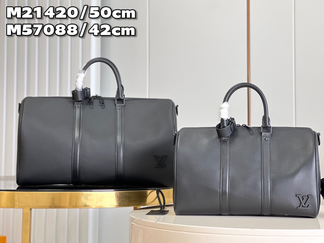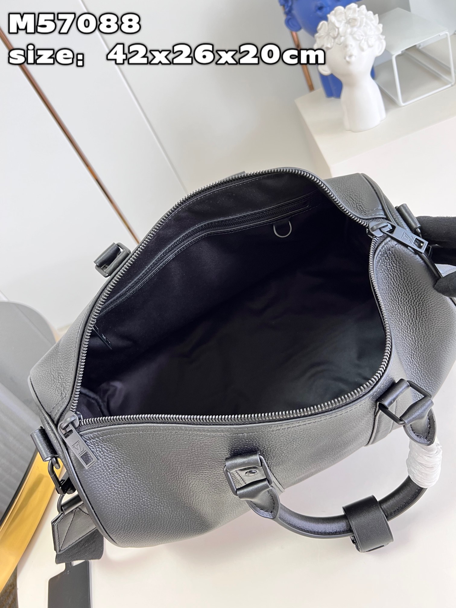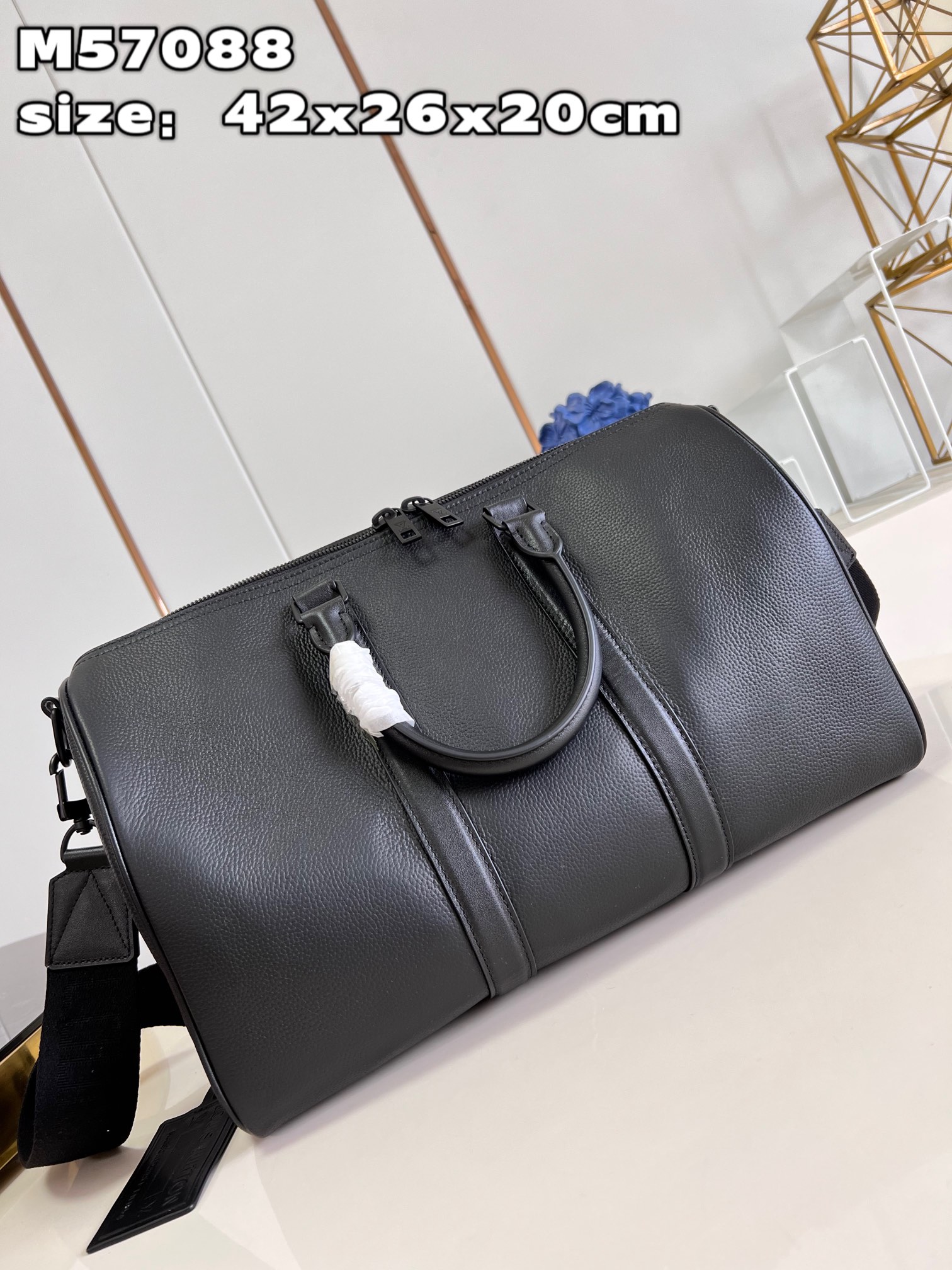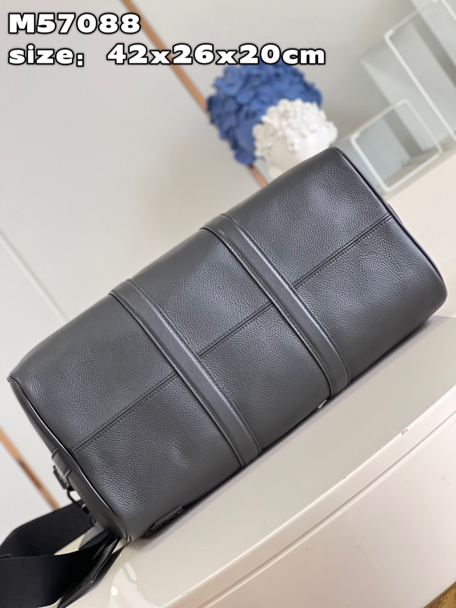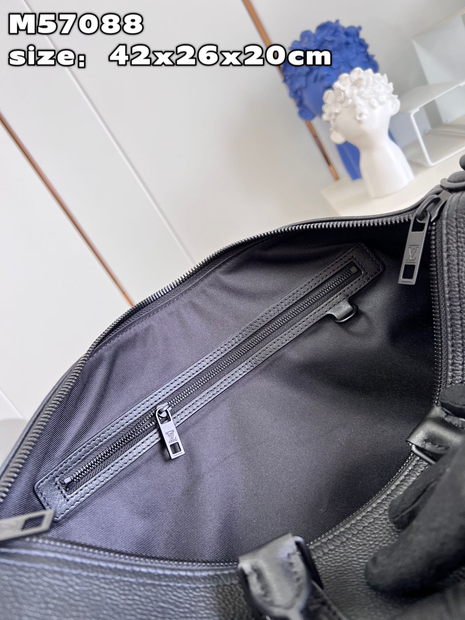 The new LV Aerogram version of the Keepall exudes low-key chic in soft, finely grained black cowhide. A host of discreet details, like the black metal “LV” initials, a customizable leather tag and a removable Jacquard strap, give it an unmistakable Louis Vuitton signature. And its user-friendly size and multiple carry options make it a versatile travel bag. Detailed Features 16.5 x 10.2 x 7.9 inches (length x Height x Width) Black cowhide leather Black cowhide-leather trim Textile lining Black hardware Double zip closure system Inside zipped pocket Removable leather tags Strap:Removable, adjustable Strap drop: 15.4 inches Strap drop max: 21.7 inches Handle:Double The reference is either made in France, Spain, Italy or in the US. M57088 Louis Vuitton Keepall Bandoulière 40 LV AEROGRAM - Men - Bags Men - Bags - Messenger and Crossbody Bags - Keepall Bandoulière 40